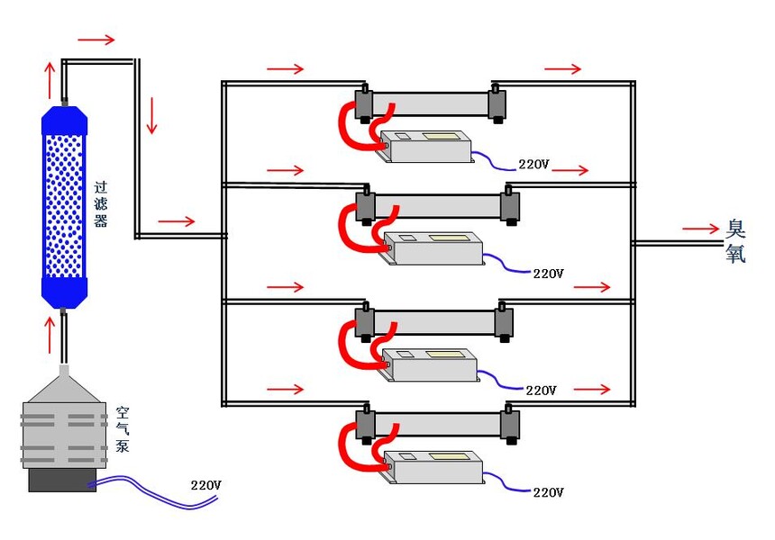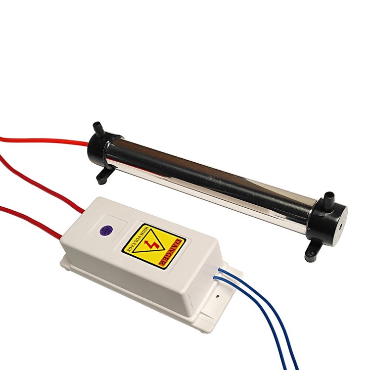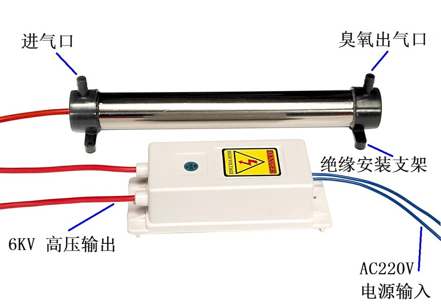 结构说明: 1.低频放电2G/H臭氧发生器配件由微间隙放电臭氧管和低频高压电源两个部分构成。 2.石英管的构成及特点:内电极316L不锈钢,外电极304不锈钢,石英介电管,阻燃抗氧化材料气嘴堵头,由于采用低频放电,臭氧管温升极低,几乎不发热,正常使用寿命1万小时。 高压电源构成及特点:真空环氧高压包;主要特点为:低频输出,产出的热量低。 产品用途说明 zcp-2低频放电2G/H臭氧发生器配件主要用于小型臭氧机上,可以一台设备安装一套或多套。是臭氧消毒机的主要核心部件,可用在需要臭氧灭菌或净化的地方,运用在水处理或空气净化杀菌除臭;如蔬果清洗消毒机,家用活氧机等。其优越的工艺做工和电参数的稳定性及超长的寿命在广大用户中得到一致的好评。 设备安装使用说明 第一步:臭氧管固定在机箱中,高压电源距离金属机箱外壳大于2厘米(高压部分如果距离金属机箱外壳太近,会形成高压涡流导致机箱外壳发热发烫,电源功率损耗过大会导致损坏)。 第二步:进气口及臭氧出口的安装:臭氧管的气嘴不分进出气嘴,任意一端均可进出,进出气口的导气管材料可用硅胶管或PC软管,要求不漏气即可,通入臭氧管进气口的空气,要确保气体洁净干燥,不含油份,温度不要高于35度,湿度不能大于70%RH。 第三部:检查线路:高压线接通臭氧管时,要尽量将高压线以最短的距离连接,配件出厂时高压线长30CM左右,安装的时候根据安装的位置尽量将高压线剪短接通,避免高压线在机箱内与其他的线路或物件碰触在一起,两条高压线至少保持0.5厘米,禁止绑扎在一起,不可避免两条高压线互相碰触的时候,可用壁厚为1.5MM以上的硅胶管套上高压线,增强绝缘。其他的线路,特别是数显的电子器件连接线,不要靠近高压部分(高压包,高压线,臭氧管),否则高压可能会干扰其正常使用功能。 |