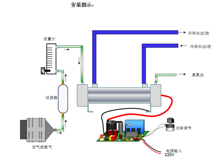 结构说明: 1.水冷30G/H臭氧发生器配件由水冷微间隙放电臭氧管和高频高压电源两个部分构成。 2.臭氧放电管的构成及特点:内电极316L不锈钢,外电极316L不锈钢管,石英介 电管,聚四氟乙烯及氟胶密封原件组合而成,外电极与臭氧管外壳焊接密封成冷却水腔 体,石英管发生器主要特点为介电值介电常熟高,介质韧性好运输途中不宜坏,热膨胀 系数低, 3.高压电源构成及特点:输出短路,断路保护、.电路抗干扰,防潮,防腐设计,正常使用 寿命8K小时以上。 产品用途说明 ZCP-30水冷30G/H臭氧发生器配件主要用于小型高浓度臭氧机上,可以一台设备安装一套或多套。是臭氧消毒机的主要核心部件,供气气源可用氧气也可用空气,可用在需要臭氧灭菌或净化的地方,一般运用在水处理,如蔬果清洗消毒机 设备安装使用说明 第一步:臭氧管和高压电源固定在机箱中,臭氧管可以直接固定在机箱外壳上。高压电源距离金属机箱外壳大于4厘米(高压部分如果距离金属机箱外壳太近,会形成高压涡流导致机箱外壳发热发烫,电源功率损耗过大会导致损坏),处于机箱内通风良好的位置。 第二步:进气口及臭氧出口的安装:臭氧管的气嘴不分进出气嘴,任意一端均可进出,进气口的导气管材料可用硅胶管或PC软管,出气口用抗氧化的管子(四氟管,氟胶管等)接通,要求不漏气即可,通入臭氧管进气口的气体,无论是氧气还是空气,都要确保气体洁净干燥,温度不要高于35度,湿度不能大于70%RH。 冷却水的安装:臭氧管采用四分外牙(20MM)的接头,臭氧管水平安装时,冷却水接头需要朝向上方,此时无论哪一个端口均可作为进出水接头;臭氧管垂直地面安装时,进水口为下端,出水口为上端。 第三部:检查线路:高压线接通臭氧管时,要尽量将高压线以最短的距离连接,配件出厂时高压线长40CM左右,安装的时候根据安装的位置尽量将高压线剪短接通,高压线必须使用电烙铁加锡焊接,接头的地方需要使用厚度2MM以上的绝缘层(可以使用2MM厚的硅胶管套上)。高压线不能与其他的线路或物件碰触在一起,悬空状态为佳,当出现不可避免高压线碰触其他物件的时候,可用壁厚为2MM以上的硅胶管套上高压线,增强绝缘。其他的线路,特别是数显的电子器件连接线,不要靠近高压部分(高压包,高压线,臭氧管),否则高压可能会干扰其正常使用功能。 |