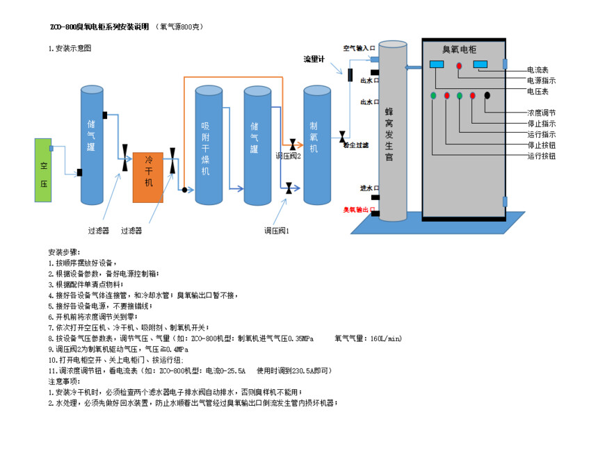 (七)产品图片 2、系统总体说明 本系统配套产量800g/h的臭氧发生器1台,采用氧气源,外置空压机、吸附干燥机、冷干机、精密过滤器、储气罐、制氧机、氧气储气罐等组成。 一套800克氧气源机器现场图: 臭氧尾气处理器图: 3、产品特点及性能说明 ◆先进的电晕放电技术 ◆优化的机械设计 ◆先进的IGBT供电单元 ◆低谐波污染 ◆低能耗 ◆臭氧浓度高、结实耐用 ◆结构紧凑 ◆低维护工作量 ◆自动化界面控制 ◆放电体 臭氧放电室采用石英管放电体,该放电体臭氧产量大,臭氧浓度高,能最大程度的发挥电源系统和冷却系统的功能,是大产量高浓度臭氧发生器的关键。 4、环境条件及设计条件 4.1环境条件 4.1.1 温度: 年平均气温12.1℃,最低温度>0℃,最高温度38.8℃。 4.1.2 湿度: 年平均相对湿度61.5%,月平均最高相对湿度85%,月平均最低相对湿度35%。 4.1.3 大气压: 年平均压力101.59KPa,最高压力104.5KPa,最低压力98.6KPa。 4.1.4 冷却水: 一般工业自来水。 4.2设计条件: 臭氧发生器按室内安装要求设计,使用方应确保设备在设计条件范围内运行。 4.2.1温度: 臭氧发生器设计环境温度范围为0—40℃。 4.2.2湿度: 臭氧发生器设计相对湿度≦75%。 4.2.3冷却水温度: 臭氧发生器设计冷却水温度<30℃。 4.2.4大气压: 臭氧发生器按标准大气压设计,即大气压为101.3KPa。 4.3气源条件: 臭氧发生器为空气源,气源露点要求<-23℃。 4.4电源条件: 室内有220v/50Hz交流电源,部分臭氧设备同时需要用到380V/50Hz交流电源。 5、臭氧发生器设计、制造和检验标准 5.1 臭氧发生器设计、制造标准 5.1.1、中华人民共和国城镇建设行业标准CJ/T3028.1-1994《臭氧发生器》; 5.1.2、国家环境保护总局中国环境保护产品认定技术条件HCRJ058-1999《臭氧发生器》。 5.2 臭氧发生器检验标准 5.2.1、中华人民共和国城镇建设行业标准CJ/T3028.2-1994《臭氧发生器臭氧浓度、产量、电耗的测量》。 6、注意事项及售后服务 注意事项:机械设备必须放置在无油污、空气干净、干燥通风的地方工作,以延长机械设备使用寿命;室内应无易燃易爆气体及导电粉尘,禁止安装在有发生爆炸危险的危险区域。 1.设备质保期 设备保修期为设备出厂之日起一年保修,终身维护; 2.故障排除 ①接到用户设备出现故障的信息后,当日给用户明确答复; 3.其他服务 质量承诺: ①所提供设备满足贵公司使用的要求,在保证设备满足所提供技术文件质量指标的前提下,保证设备的安全性、可靠性、稳定性。 ②供方向需方保证:如因设计、制造上的缺陷和材料上的不良而使设备发生故障,供方为需方免费修理并更换新损坏零件,期限为设备出厂之日起一年保修期内。 ③在正常的使用情况下,整机设备使用寿命为10年。 ④不受设备改型而影响配件的供应,保质期外终生以最优惠的价格为用户提供该设备的配件。在保修期内发生下列情况之一者,不属于免费维修范围: A、环境过于潮湿或机器结构内部进水而导致产品损失 B、擅自改动产品结构而导致产品损坏 C、因自然灾害或其它不可抗力而导致产品损坏 D、因操作不当导致机器出故障。 |